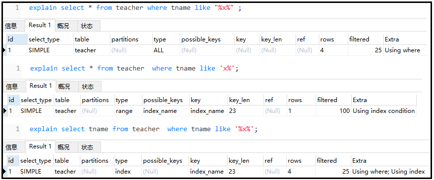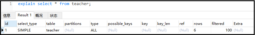 复制explain select * from teacher;1.结果如下: