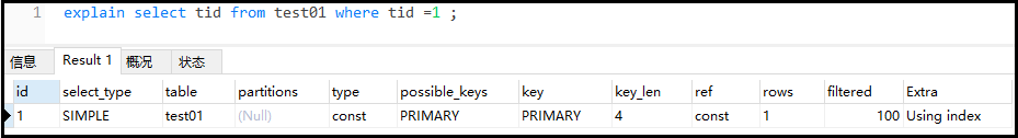 复制explain select tid from test01 where tid =1 ;1.结果如下: