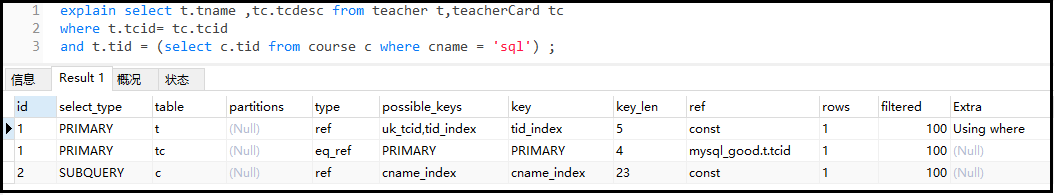 ③ 针对②做一个简单的修改 复制# 查看执行计划 explain select t.tname ,tc.tcdesc from teacher t,teacherCard tc where t.tcid= tc.tcid and t.tid = (select c.tid from course c where cname = sql) ;1.2.3.4.结果如下: