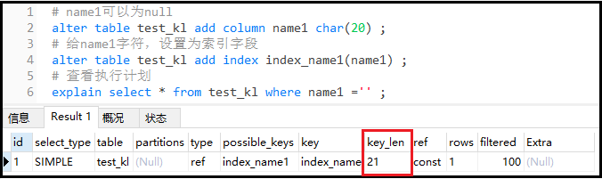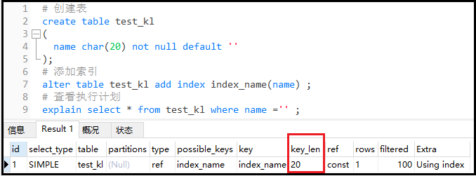 ① 新建一张新表,用于测试 复制# 创建表 create table test_kl ( name char(20) not null default ); # 添加索引 alter table test_kl add index index_name(name) ; # 查看执行计划 explain select * from test_kl where name = ;1.2.3.4.5.6.7.8.9.结果如下: