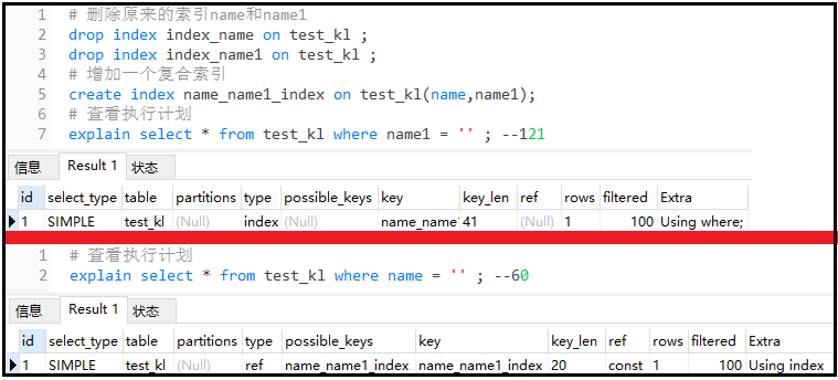 ③ 删除原来的索引name和name1,新增一个复合索引 复制# 删除原来的索引name和name1 drop index index_name on test_kl ; drop index index_name1 on test_kl ; # 增加一个复合索引 create index name_name1_index on test_kl(name,name1); # 查看执行计划 explain select * from test_kl where name1 = ; --121 explain select * from test_kl where name = ; --601.2.3.4.5.6.7.8.结果如下: