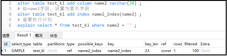复制# 新增一个字段name2,name2可以为null alter table test_kl add column name2 varchar(20) ; # 给name2字段,设置为索引字段 alter table test_kl add index name2_index(name2) ; # 查看执行计划 explain select * from test_kl where name2 = ;1.2.3.4.5.6.结果如下: