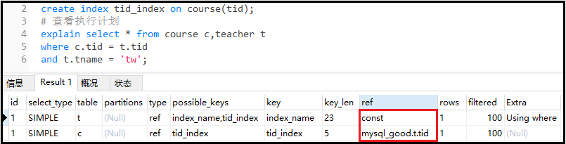 结果分析: 有两个索引,c表的c.tid引用的是t表的tid字段,因此可以看到显示结果为【数据库名.t.tid】,t表的t.name引用的是一个常量"tw",因此可以看到结果显示为const,表示一个常量。