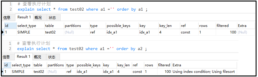 复制# 新建一张表,建表同时创建索引 create table test02 ( a1 char(3), a2 char(3), a3 char(3), index idx_a1(a1), index idx_a2(a2), index idx_a3(a3) ); # 查看执行计划 explain select * from test02 where a1 = order by a1 ; explain select * from test02 where a1 = order by a2 ;1.2.3.4.5.6.7.8.9.10.11.12.13.结果如下: