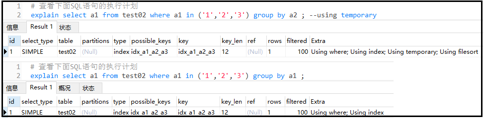 复制explain select a1 from test02 where a1 in (1,2,3) group by a1 ; explain select a1 from test02 where a1 in (1,2,3) group by a2 ; --using temporary1.2.结果如下:
