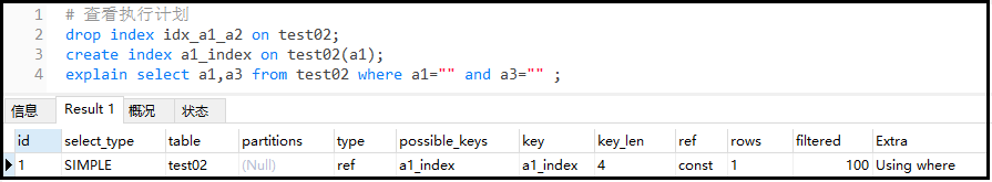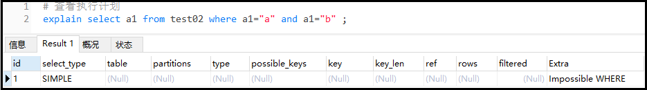 复制# 查看执行计划 explain select a1 from test02 where a1="a" and a1="b" ;1.2.结果如下: