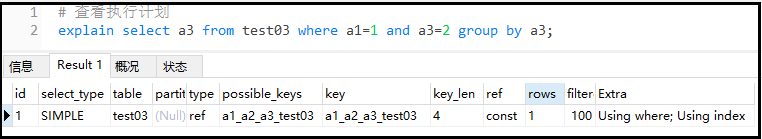 复制# 查看执行计划 explain select a3 from test03 where a1=1 and a3=2 group by a3;1.2.结果如下: