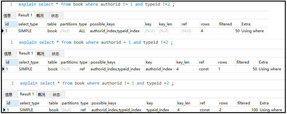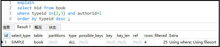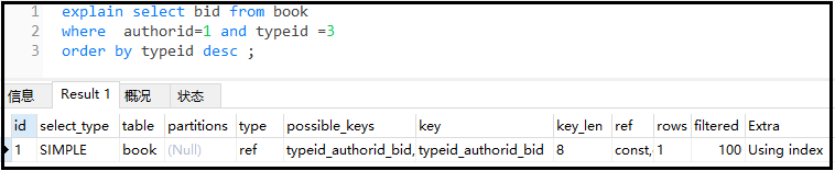 复制explain select bid from book where authorid=1 and typeid =3 order by typeid desc ;1.2.3.结果如下: