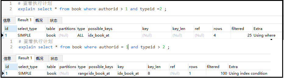 复制# 删除单独的索引 drop index authorid_index on book; drop index typeid_index on book; # 创建一个复合索引 alter table book add index idx_book_at (authorid,typeid); # 查看执行计划 explain select * from book where authorid > 1 and typeid = 2 ; explain select * from book where authorid = 1 and typeid > 2 ;1.2.3.4.5.6.7.8.结果如下: