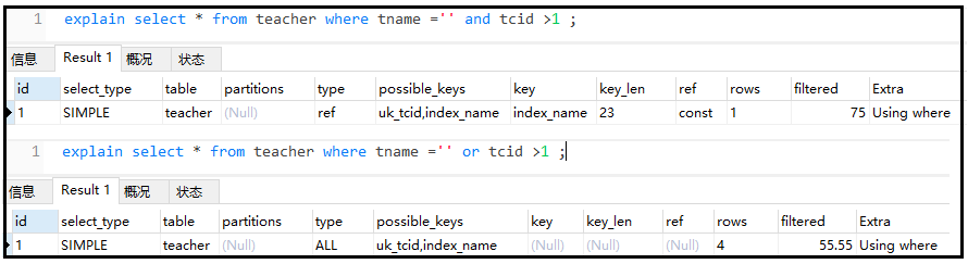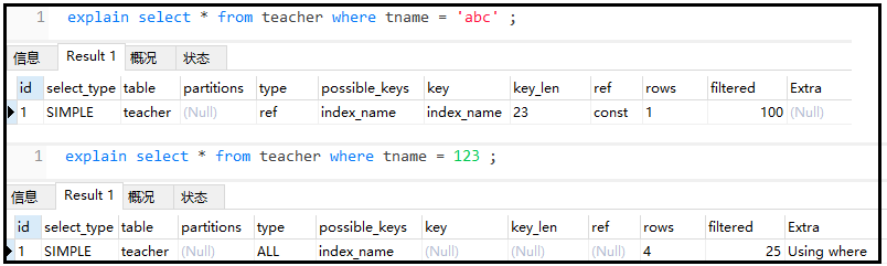⑦ 尽量不要使用类型转换(显示、隐式),否则索引失效 复制explain select * from teacher where tname = abc ; explain select * from teacher where tname = 123 ;1.2.结果如下: