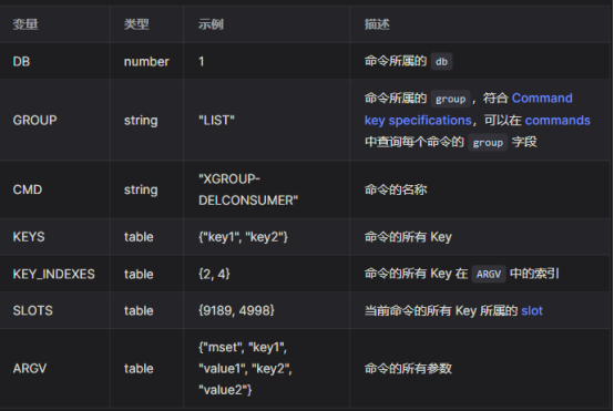因为有些命令中含有多个 key,比如 mset 等命令。所以,KEYS、KEY_INDEXES、SLOTS 这三个变量都是数组类型。如果确认命令只有一个 key,可以直接使用 KEYS[1]、KEY_INDEXES[1]、SLOTS[1]。