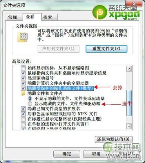 第三步:选择小窗口的查看选项,去掉“隐藏受保护的操作系统文件”,再选中“显示隐藏的文件、文件夹或驱动器”。